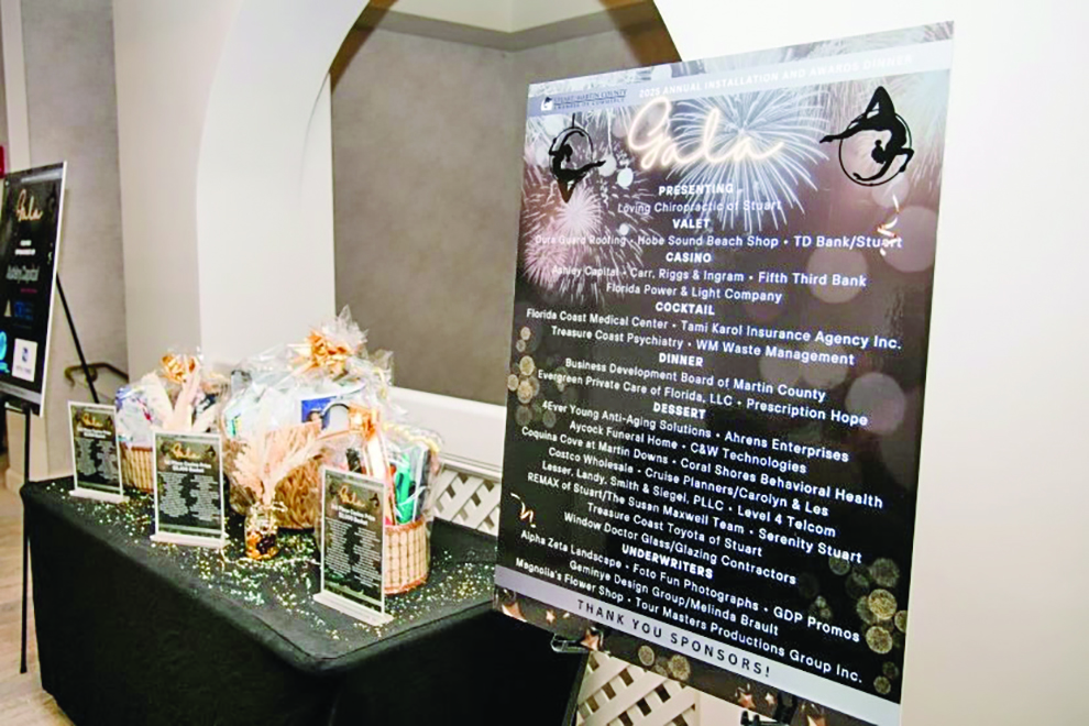 The annual Installation and Awards Gala is made possible by generous event sponsors. Presenting: Loving Chiropractic of Stuart, Valet: Dura Guard Roofing, Hobe Sound Beach Shop, and TD Bank/Stuart, Casino: Ashley Capital, Carr, Riggs & Ingram, Fifth Third Bank, Florida Power & Light Company. Others sponsors were Florida Coast Medical Center; Tami Karol Insurance Agency Inc.; Treasure Coast Psychiatry; WM; Business Development Board of Martin County; Evergreen Private Care of Florida, LLC; Prescription Hope; 4Ever Young Anti-Aging Solutions; Ahrens Companies; Aycock Funeral Home; C&W Technologies; Coquina Cove at Martin Downs; Coral Shores Behavioral Health; Costco Wholesale; Cruise Planners/Carolyn & Les; Lesser, Landy, Smith & Siegel, PLLC; Level 4 Telcom; REMAX of Stuart/The Susan Maxwell Team; Serenity Stuart; Treasure Coast Toyota of Stuart; Window Doctor Glass/Glazing Contractor; Alpha Zeta Landscape; Foto Fun Photobooths; GDP Promos; Geminye Design Group/Melinda Brault; Magnolia’s Flower Shop; Tour Masters Productions Group Inc. Photo by Fred Kirkhart-Stuart Photography Company