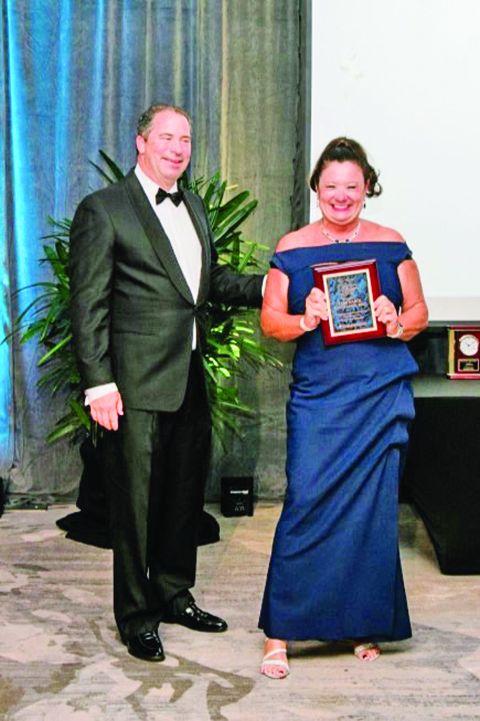 Chamber Chairman Dan Hulen, Fifth Third Bank Merchant Services/Worldpay, presented a chamber tradition – the “Toots Armellini” Business of the Year Award – to Tami Karol Insurance during the Installation Gala held on Sept. 27 at Marriott Hutchinson Island Beach Resort. Agency owner Tami Karol accepted the award to roaring applause, as she was commended for her entrepreneur mentorship and advocate for insurance education and reform. Photo by Fred Kirkhart-Stuart Photography Company