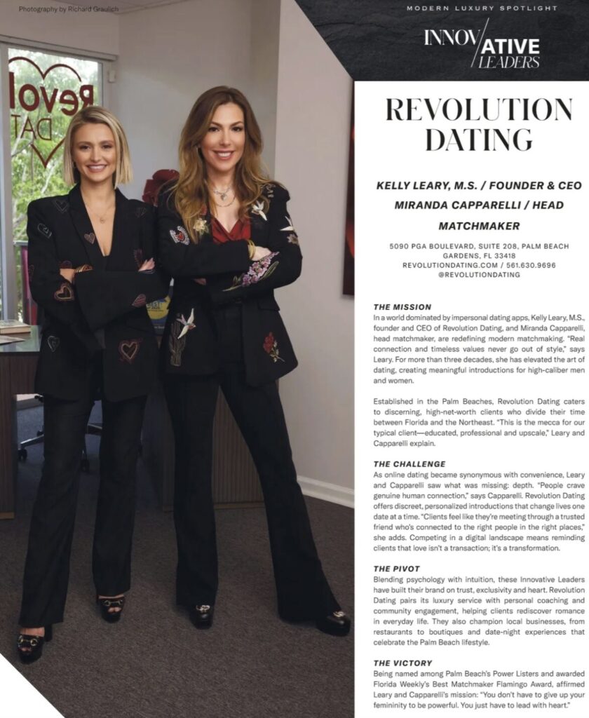 Kelly Leary, M.S.© is CEO and Founder of Revolution Dating which she launched in 2014. Kelly has 35 years in the dating industry and a master’s degree in clinical psychology. She has been written about in Modern Luxury Magazine Palm Beach and Modern Luxury Manhattan, The Palm Beach Post, The Shiny Sheet, Stuart News, The Coastal Pearl, Jupiter Magazine, and many more. Revolution Dating clients are pre-screened in person, including background checks and ID verification. Professional photos are taken by the staff. Revolution Dating is NOT online dating or blind dating. In addition to providing matchmaking services that make singles “UN-single” through their exclusive club memberships, Kelly and Miranda also provide feedback from dates when appropriate. Mock Dates are available by request. Single Coaching Sessions and Evaluations are also available by request for non-members or as an add-on to some memberships. *All inquiries are confidential *Specializing in representing jet-setting clients with a second home in the Northeast Area or Mountain Country. Do call the central hotline at 561- 630-9696 (XOXO) to hold your place in the club. Why wait? Just date!
