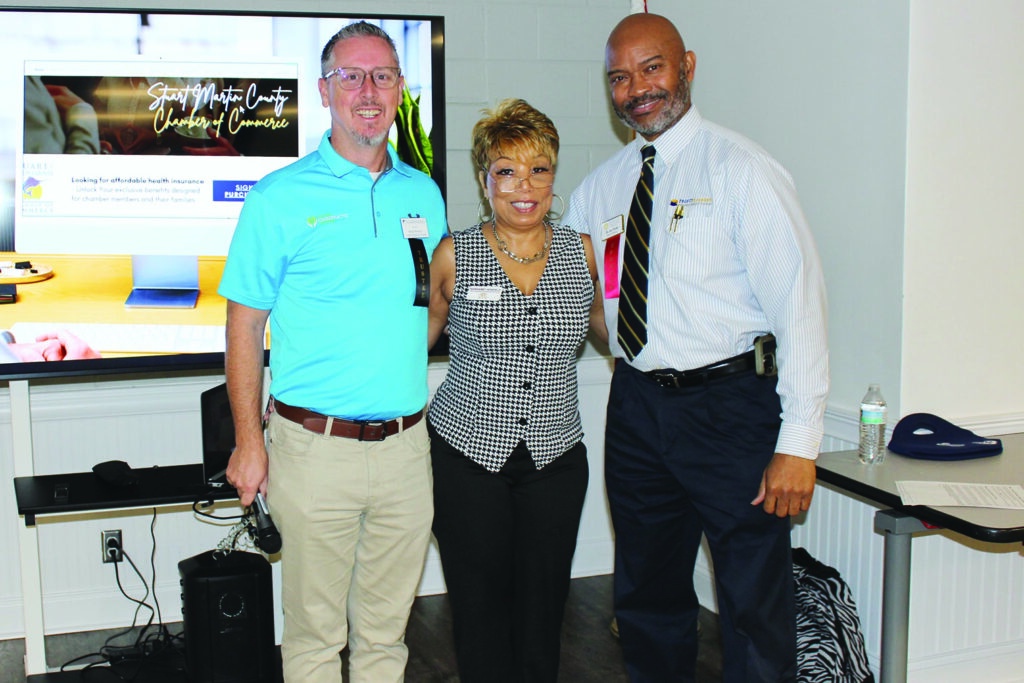 As sponsor of the Stuart/Martin County Chamber’s Jan. 13 Business B4 Breakfast at 10th Street Community Center, Ambassador Margaret Winfield, AYG Insurance and Financial Services, gave an informative presentation on the specialized group insurance program she is offering to chamber members. Offering Margaret support during her presentation were Chamber Chairman/Trustee Dr. Brian Moriarty, Loving Chiropractic of Stuart (left), and her colleague Dr. Joe Webb.