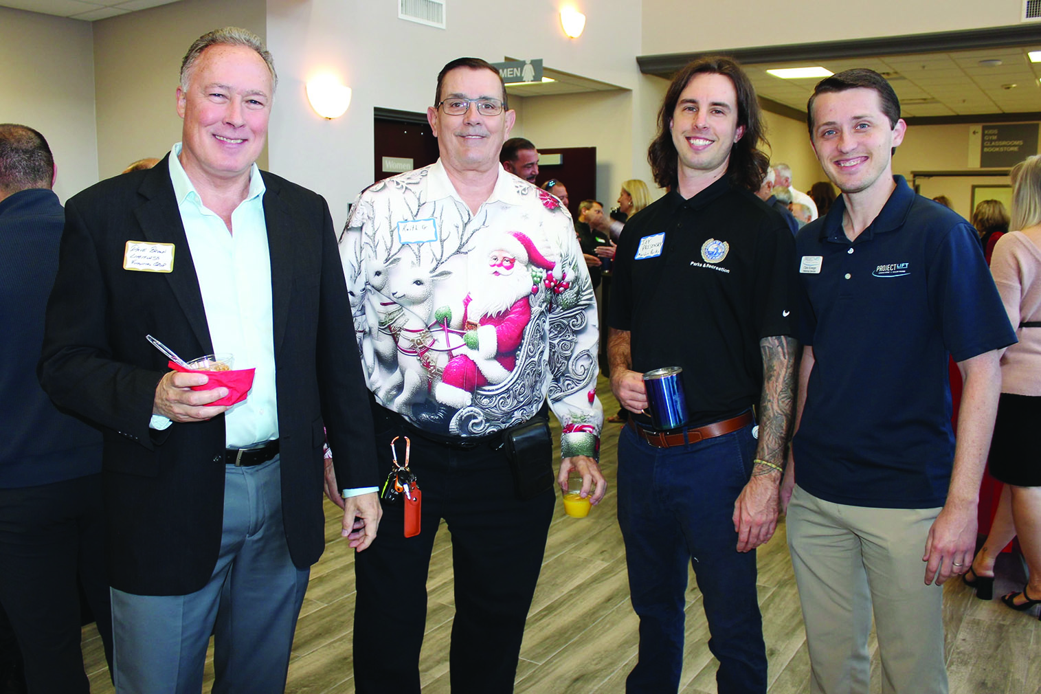 Enjoying snacks, refreshments and networking at the Stuart/ Martin County Chamber’s Dec. 16 Business B4 Breakfast at The Grace Place were (left to right) Dave Brown, Limitless Financial Group; new member Keith Griffin, Southeast Merchant Solutions; Jay Presensky, Martin County Parks and Recreation; and Chris Krueger, Project Lift.
