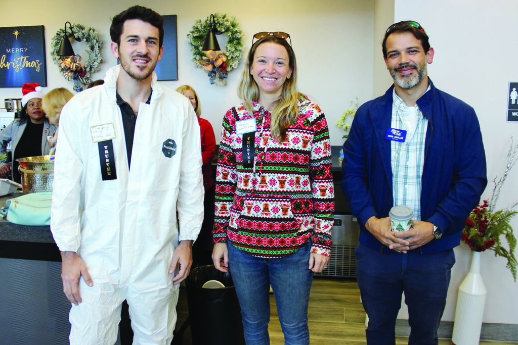 Stuart/Martin County Chamber Trustee Nathan Todd, Florida Emergency Cleaning, left, was dressed to clean as he visited with fellow Trustee Kaylin Obards, South Florida Orthopaedics & Sports Medicine, and Bob Mullis, Groovy Hues, during the Dec. 16 Business B4 Breakfast at The Grace Place.